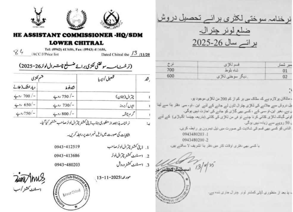 - چترال لوئر سوختنی لکڑی کی سرکاری ریٹ مقرر،دروش سے لکڑی کی ترسیل کے لئے این او سی لازمی قرار