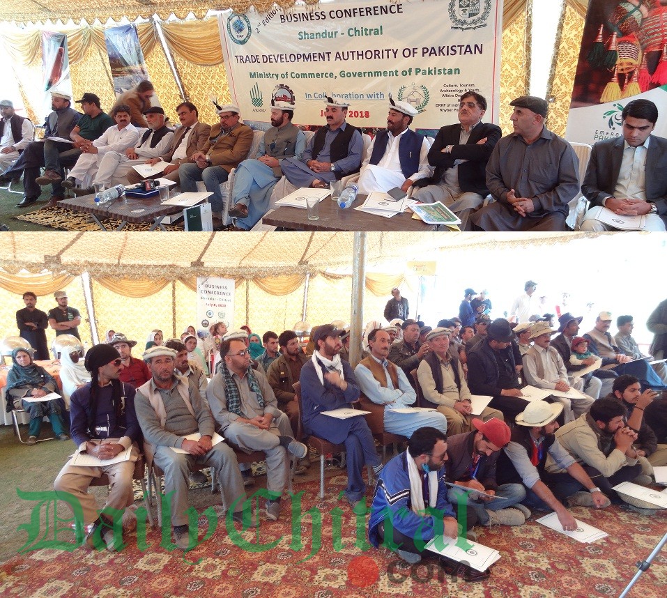 ضحیم مقدار دستیاب ہے جس کا اندازہ 297 ارب میٹرک ٹن لگایا گیا ہے اور معدنی ذخائر اور قیمتی پتھر اس کے علاوہ ہیں ۔ پھل اور سبزیوں کے ساتھ ساتھ یہاں شہد کی پیدوار کے بھی وسیع امکانات موجود ہیں اور چترال میں اسپیشل اکنامک زون کے قیام سے یہاں قدرتی وسائل سے فائدہ اٹھانے کا کام شروع ہوگا۔ انہوںنے کہاکہ ٹورزم اور ہائیڈروپاﺅر پوٹنشل بھی چترال کی معاشی ترقی میں اہم ستون مانے جاتے ہیں۔ کلکٹر کسٹمز ڈاکٹر اویس جدون نے کہاکہ چترال میں ارندو اور شاہ سلیم کے بارڈرمیں انٹری پائنٹ اور کسٹمز اسٹیشن کے قیام کا جائزہ لیا گیا ہے جن سے علاقے میں معاشی سرگرمیوں میں تیزی آئے گی ۔ ان کا کہنا تھاکہ شاہ سلیم تاریخی روٹ ہے جس کے ذریعے یہاں سے سیمنٹ، ادویات ، پھل اور سبزی اوردوسری کئی اشیاءسنٹرل ایشیائی ریاست تاجکستان بھیجے جاسکتے ہیں۔ انہوںنے کہاکہ ٹورزم کے حوالے سے چترال پاکستان کا سویٹزرلینڈ ہے جس کی قدرتی حسن کو سیاحت کے لئے ایک آئیدیل موقع فراہم کرتا ہے ۔ ٹی سی کے پی کے منیجنگ ڈائرکٹر مشتاق احمد خان نے کہاکہ اس وقت ٹورزم تیل کی پیدوار کے بعد سب سے منافع بخش شعبہ ہے اور چترال کی ترقی میں سیاحت کی بے پناہ پوٹنشل سے فائدہ اٹھانے کی ضرورت ہے جس کے لئے ان کا ادارہ کوشان ہے ۔ انہوںنے کہاکہ شندور پولو فیسٹول کے لئے ان کے ادارے نے اس سال 4کروڑ روپے ریلیز کی ہے تاکہ یہ جشن شایان شان طور پرمنعقد ہو جس سے سیاحت کی ترقی ہوتی ہے۔ اسپیشل اکنامک زون اتھارٹی کے عباداللہ اور مدثر نے کہا کہ چترال میں گہیریت کے مقام پر 50کروڑ روپے کی لاگت سے زمین خریدی گئی ہے جہاں اسپیشل اکنامک زون قائم کیا جائے گا جبکہ ماربل سٹی کے قیام کے لئے پلاننگ کی گئی ہے۔ عمرحسن نے چترال کے مختلف علاقوںمیں معدنی ذخائر کی تفصیلات بتائی اور کہاکہ اب لواری ٹنل کی تکمیل او ر یہاں بجلی کی دستیابی کے ساتھ ان سے استفادہ کرنے کا عین وقت آگیا ہے۔ اس موقع پر اپنے خطاب میں جعفراللہ خان نے شندور کے مقام پر بزنس کانفرنس منعقد کرنے پر چترال چیمبر آف کامرس اور ٹی ڈی اے پی کی کاوشوں کو سراہتے ہوئے کہاکہ ترقی کا عمل سوچ بچار اور اس پر عملدرامد کے لئے منصوبہ بند ی سے شروع ہوتی ہے۔ انہوںنے کہاکہ گلیشیر ، دریا، جنگلات، صحرا ، جنگلات اور جفاکش لوگ بھی ان علاقوںمیں موجود ہونے کے باوجود اس علاقے میں ترقی نہ ہونا سوچنے کی بات ہے۔ انہوںنے کہاکہ اب وقت ہے کہ ہم خواب غفلت سے نکلنے کے لئے دوائی کا ہائی ڈوز (dose)لے لیں ا ور ان خامیوں اور کمزوریوں کو دور کریں جن کی وجہ سے ترقی یہاں سے کوسوں دور ہے۔ اپنے صدارتی خطاب میں گلگت بلتستان کے صوبائی وزیر سیاحت فدا خان فدا نے کہاکہ شندور کا میلہ ہمیں آپس میں محبت بانٹنے کا موقع فراہم کرتی ہے اور دونوں علاقوں کے عوام ایک دوسرے کے قریب آتے ہیں جوکہ کئی صدیوں سے ایک ساتھ چلے آرہے ہیں اور اور ان میں زبان اور ثفافت کے علاوہ کئی اور اقدار مشترک ہیں۔ انہوںنے کہاکہ گلگت بلتستان کے پھنڈر اور چترال کے کاغ لشٹ میں بزنس کانفرنس اور میلہ منعقد کئے جائیں گے جس سے دونوں علاقوں کے عوام ایک دوسرے کے مزید قریب آئیں گے جن کی لیڈرشپ کو چاہئے کہ وہ ایک دوسرے کا ہاتھ پکڑ کر آگے جانے کا وطیرہ اپنائیں اور ایک دوسرے کو فائدہ پہنچاتے رہیں جس سے دونوں کا مفاد وابستہ ہے۔