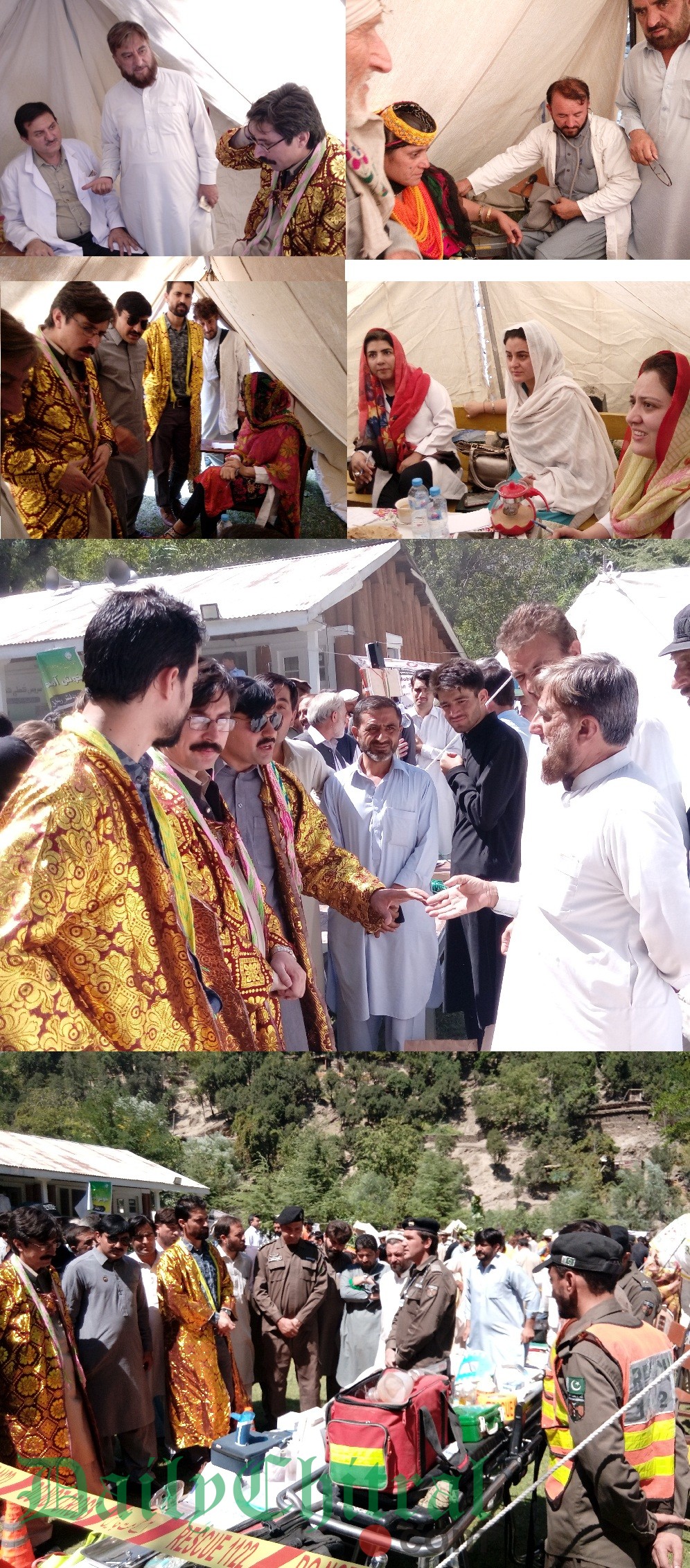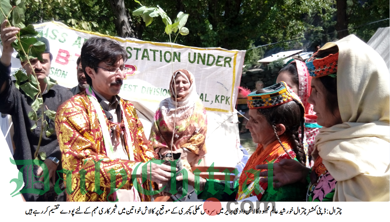 شکریہ ادا کیا۔مختلف سرکاری محکمہ جات کے سربراہان ڈسٹرکٹ افیسر فنانس حیات شاہ، ڈی ایچ او ڈاکٹر اسرار اللہ، ٹی ایم او قادر ناصر، ڈی ای او (مردانہ) احسان الحق، ڈی ای او (زنانہ) بی بی حلیمہ، ڈی ایف سی فضل باری، اسسٹنٹ ڈائرکٹر لوکل گورنمنٹ انجینئر فہیم جلال، آغا خان ہیلتھ سروس کے پراجیکٹ منیجر معراج الدین اور دوسرے موجود تھے ۔ اس موقع پر محکمہ صحت اور آغا خان ہیلتھ سروس کی طرف سے فری میڈیکل کیمپ بھی لگائے گئے تھے جبکہ لائیو اسٹاک ڈیپارٹمنٹ کی طرف سے بھی کمیپ لگایا گیا تھا جہاں ادویات دستیاب تھے۔ ڈی سی خورشید عالم نے اے سی چترال کے ہمراہ مقامی ہائی سکول کا بھی وزٹ کیا اور طلباء وطالبات سے ان کی تعلیمی مسائل پر گفتگو کی۔ ڈپٹی کمشنر چترال خورشید عالم محسود اور اے سی چترال ساجد نواز خان نے دیودار کا پودا لگاکر شجرکاری مہم کا بھی افتتاح کیا۔