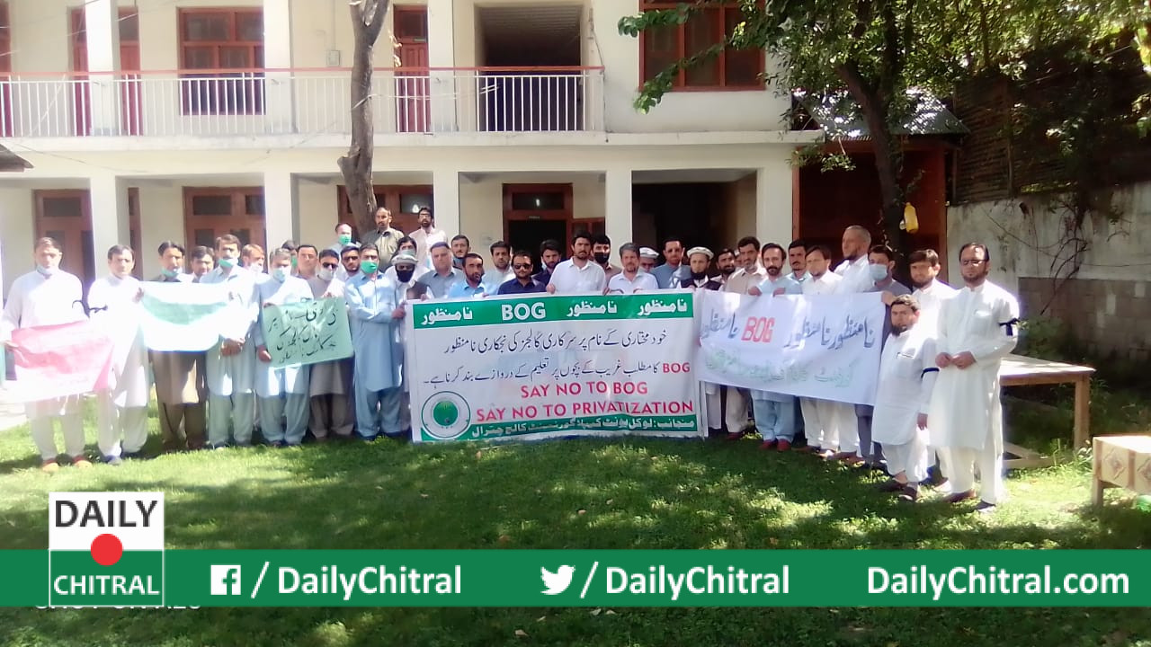 گورنمنٹ کالج چترال، بونی کے تدریسی اسٹاف نے صوبائی حکومت کی طرف سے پبلک سیکٹر کے کالجوں کو پرائیویٹائز کرنے کے لئے بورڈ آف گورنرز قائم کرنے کے فیصلے کے خلاف چترال پریس کلب کے سامنے مظاہرہ