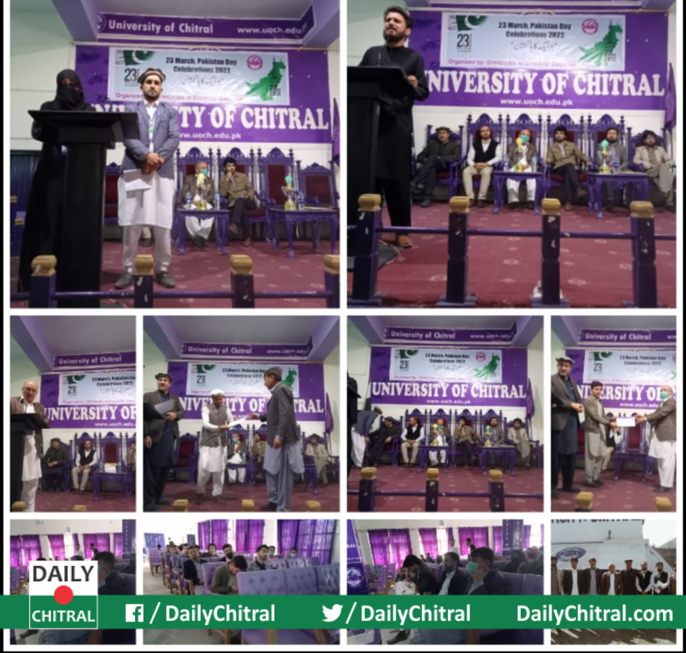 یوم پاکستان 23 مارچ 2022 کو یونیورسٹی آف چترال میں منایا گیا، اس سلسلے میں ڈائریکٹوریٹ آف اسٹوڈنٹس سوسائٹیز یونیورسٹی آف چترال کے زیر اہتمام ایک پروگرام کا انعقاد کیا گیا، پروگرام کے مہمان خصوصی پروفیسر ڈاکٹر تاج الدین، پرووسٹ یونیورسٹی آف چترال تھے۔ اس موقع پر انہوں نے کہا کہ برصغیر کے مسلمانوں کے لیے علیحدہ وطن کے قیام کا نظریہ اس دن قرارداد لاہور کی صورت میں قبول کیا گیا تھا۔ڈائریکٹوریٹ آف سٹوڈنٹس سوسائٹیز کی جانب سے تقریری اور کوئز مقابلے کا بھی اہتمام کیا گیا تھا جس میں کثیر تعداد میں طلباء نے شرکت کی۔ طلباء نے شرکت کی۔پروگرام کے اختتام پر طلباء میں ٹرافیاں اور اسناد تقسیم کی گئیں۔