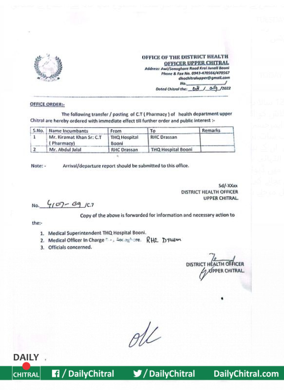 ڈی ایچ او اورایم ایس نے مزید بتایاکہ واقعے کی شفاف انکوائری کے لئے کمیٹی تشکیل دے رہی ہیں۔ ہسپتالوں میں مریضوں کی دیکھ بھال اور علاج معالجے میں غفلت کسی صورت برداشت نہیں کی جائے گی۔انکوائری کے بعدغفلت کے ذمہ داروں کاتعین کرکے قانونی کارروائی کی جائے گی ۔ جاں بحق بچی کے لواحقین سے دلی ہمدردی ہے ہیں اور اظہار تعزیت کی۔تاہم مرحومہ بیٹی کی ولد اس سے مطمئن نہ ہوسکی اور انجام کار مذکورہ اسٹاف کرامت خان کی ٹرانسفر پر معاملہ وقتی طورپر رفعہ دفعہ ہوا۔