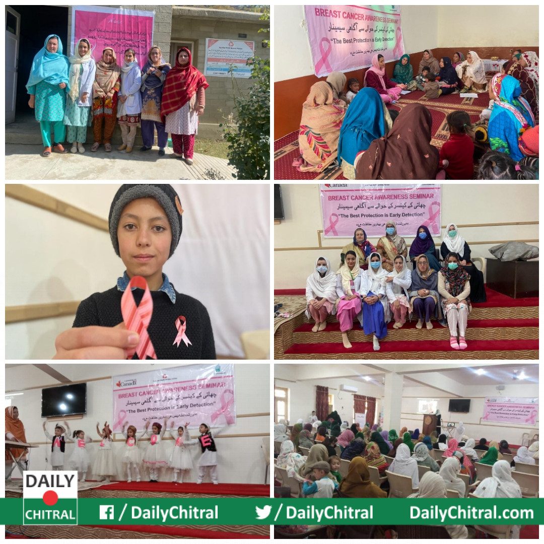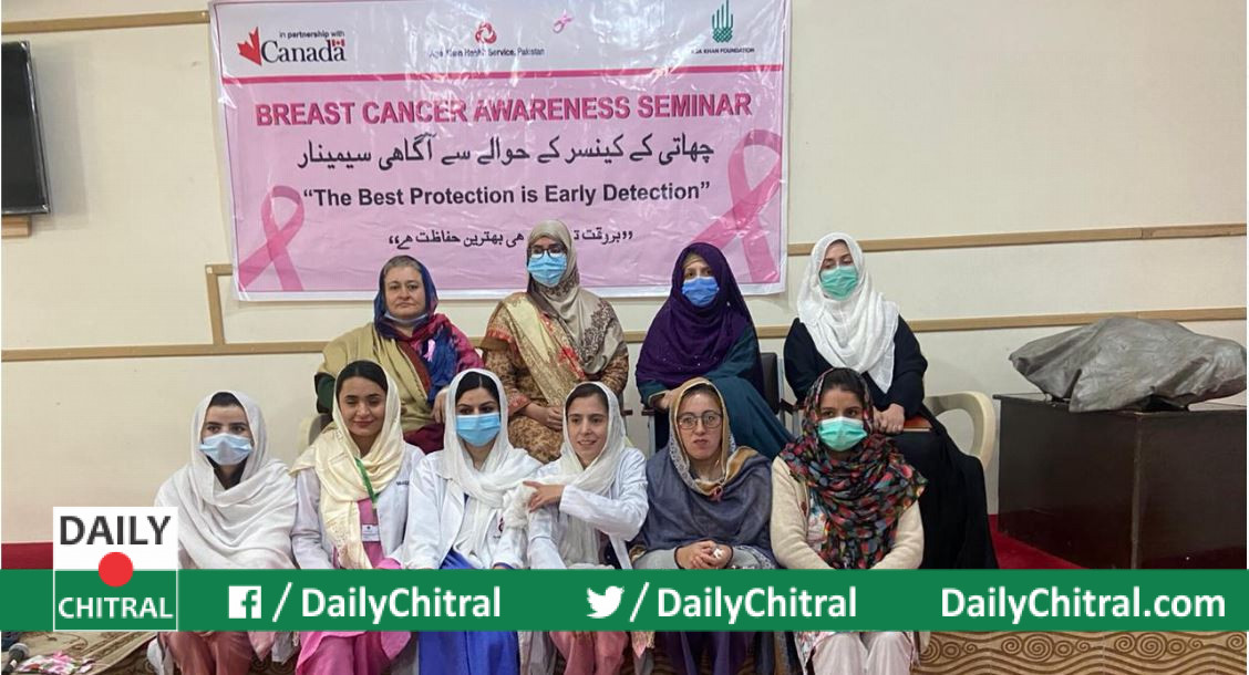 سمینارسے خطاب کرتے ہوئے ڈاکٹرشبانہ،ڈاکٹرسمیرا،ڈاکٹرشاہ زیباجہاں اوردوسرں نے کہاکہ کہ چھاتی کے سرطان سے متعلق آگاہی کا مہینہ ایک بین الاقوامی صحت مہم ہے جو اکتوبر کے پورے مہینے تک جاری رہتا ہے اور اس کا مقصد چھاتی کے کینسر کے بارے میں آگاہی دیناہے ۔انہوں نے بتایاکہ اگر 40سال سے زیادہ عمر کی خواتین میں معمول کی میموگرافی کرائی جائے تو چھاتی کے کینسر سے ہونے والی اموات کا ایک تہائی حصہ روکا جا سکتا ہے۔ آغاخان ہیلتھ سروس چترال اپنے تمام بیسک ہیلتھ سینٹر وں میں تربیتی یافتہ اسٹاف کے زریعے چھاتی کے سرطان کی ابتدائی معائنہ اورآگاہی دینے کابندوبست کیاگیاہے ۔اس دوران کسی خواتین کی ٹیسٹ میں فرق نظرآتے ہیں تواُن کوفوری طورپرریفرکرتے ہیں تاکہ بروقت علاج کرسکےاگرمرض کی تشخیص ابتدائی مرحلے پر ہوجائے تو علاج آسان اور اس سے مکمل چھٹکارا کافی حد تک ممکن ہوتا ہے اور خواتین کو قائل کیا جائے کہ وہ اپنے ٹیسٹ ضرور کروائیں یا کم از کم خود اپنا معائنہ کریں کہ کہیں وہ بریسٹ کینسر کی جانب تو نہیں بڑھ رہیں۔