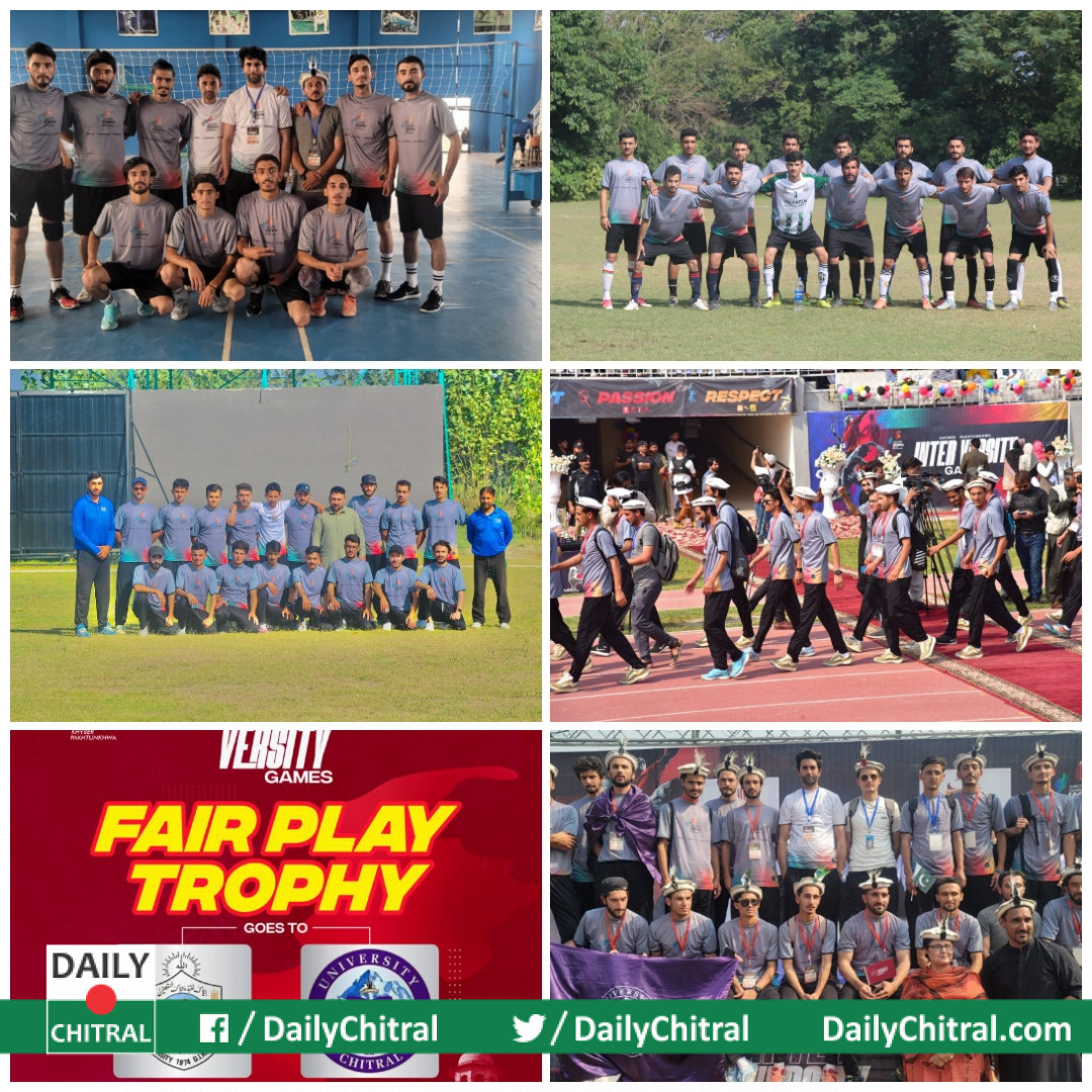 یونیورسٹی آف چترال کے پچاس رکنی دستے نے فٹبال ، کرکٹ اور والی بال کے ایونٹس میں اپنی صلاحیتوں کے جوہر دکھائے۔افتتاحی تقریب میں یونیورسٹی نے تمام شرکا کی توجہ حاصل کی اور گیمز کے دوران اپنی بہتریں آل راونڈ پرفارمنس ، سپورٹس مین سپرٹ کی وجہ سے یونیورسٹی آف چترال اور گومل یونیورسٹی ڈی آئی خان کو مشترکہ طور پر فیر پلے ٹرافی کے اعزاز سے نوازا گیا۔ وائس چانسلر یونیورسٹی آف چترال پروفیسر ڈاکٹر ظاہر شاہ نے یونیورسٹی آف چترال کے تمام شرکت کرنے والے پلیرز اور آفیشلز کو اس اعزاز پر مبارک باد دی اور امید ظاہر کی کہ طلباء آئندہ بھی اس طرح کے مثبت سرگرمیوں سے یونیوسٹی کا نام روشن کریں گے اور یونورسٹی انتظامیہ آئیندہ بھی با صلاحیت طلباء کو ہر ممکن بہترین پلیٹ فارم مہیا کرے گی اور یونیورسٹی اس سال ذیادہ سے ذیادہ ایچ ای سی کے کھیلوں کے ایونٹس میں شرکت کرے گی۔