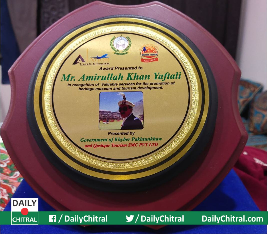 چترالی ثقافت کو ہیر ٹیج میوزیم کی شکل میں زندہ رکھنے اور چترال میں سیاحت کو فروغ دینے میں صوبے بھر میں شاندار کارکردگی دیکھانے پر امیر اللہ خان یفتالی کو تعریفی اسناد سے نوازا گیا