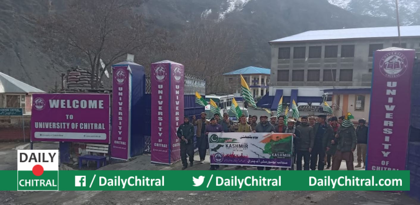 چترال (نامہ گار)یونیورسٹی آف چترال میں یوم یکجہتی کشمیر منایا گیا۔ محکمہ ہائر ایجوکیشن اور وائس چانسلر یونیورسٹی آف چترال کی ہدایت پر یونیورسٹی انتظامیہ کی جانب سے کشمیر یکجہتی واک کا اہتمام کیا گیا، واک میں سٹاف اور عام لوگوں نے شرکت کی، شرکاء نے مقبوضہ کشمیر میں بھارتی مظالم کے خلاف نعرے لگائے اور بھارتی مظالم کے خاتمے کا مطالبہ کیا۔ ریلی کے شرکاء کا کہنا تھا کہ کشمیریوں کو اقوام متحدہ کی قرارداد کے مطابق حق خود ارادیت دیا جائے۔ ریلی کی قیادت اسسٹنٹ ڈائریکٹر ایڈمنسٹریشن مصطفی کمال نے کی۔