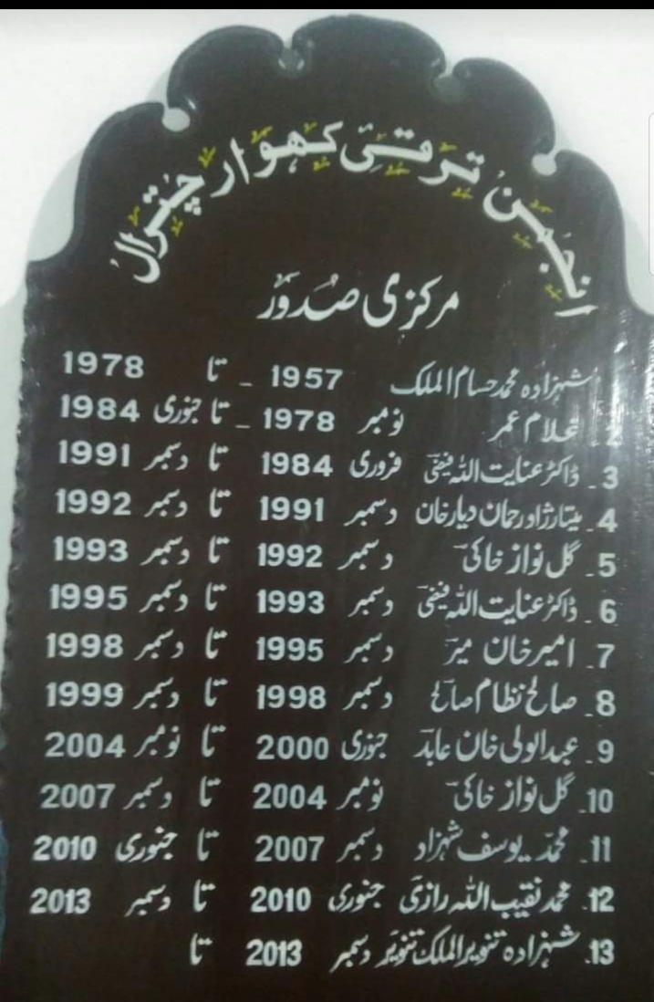 شہزادہ محمدحسام الملک 1957ء میں اس تنظیم کے قیام سے اگست1977ء میں اپنی وفات تک صدر کے عہدے پرفائزرہے۔آپ کے دور صدارت میں شیراحمد کابلی کافارسی شاہنامہ چترال،کھوارکتاب ”نمیژ“یعنی نمازاورقرآن شریف کا پہلاپار ہ ترجمے کے ساتھ شائع ہوا۔اس دوران شہزادہ صمصام الملک کی تالیف ”کھوارگرامر“ پشتواکیڈمی پشاورکے تعاون سے شائع کی گئی۔شہزادہ محمدحسام الملک مرحوم کی کوششوں کے نتیجے میں 1965ء میں ریڈیو پاکستان پشاور سے کھوارپروگرام شروع کیاگیااور1967 ء میں شہزادہ موصوف کی کوششوں کے طفیل پشتورسالہ جمہور اسلام میں کھوارزبان کے لیے صفحے مختص کیے گیے اور جناب اقبال حیات اس رسالے کے کھوارسیکشن کے پہلے مدیرمقررہوئے۔ اس انجمن کے قیام کے بعدشعرا اوراَدیبوں کوایک پلیٹ فارم میسر آیا تو یہاں کے اَدیبوں اورشاعروں نے منظم اورمربوط طریقے سے کھوارزبان واَدب اوریہاں کی ثقافت کے تحفظ کے لیے گرانقدرخدمات انجام دیں۔ شہزادہ محمد حسام الملک کی وفات کے بعداسی انجمن ترقی چترال نے انجمن ترقی کھوارکاروپ دھارلیاجوآج چترال کی سب سے بڑی نمائندہ اَدبی تنظیم ہے۔ شہزادہ محمدحسام الملک کی ملی واَدبی خدمات کے حوالے سے چترال کے ممتازادیب اوردانشور جناب پروفیسراسرار الدین لکھتے ہیں کہ ”شہزادہ صاحب جب نظربندی سے واپس آئے تونئی تنظیم (1954ء)تک گورنردروش کے عہدے پربحال رہے۔اس کے بعداپنی وفات تک اپنے فارغ اوقات کوکھوکلچرپرتحقیق اور کھوارزبان واَدب کے فروغ کے لیے وقف کیا۔انجمن ترقی کھوار آپ کی یادگارہے جو1957ء سے کھوارزبان واَدب کی ترقی کے لیے کوشاں ہے اس وجہ سے آپ کو بابائے کھوارکالقب دیاگیاہے اوراسی نام سے ہمیشہ یادرکھے جائیں گے۔“