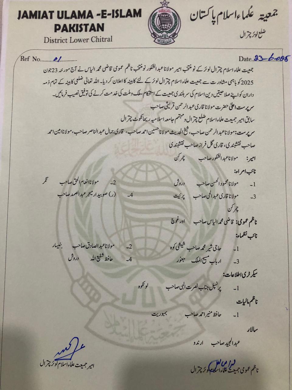 جی یو آئی لوئر چترال، کامیاب انٹراپارٹی انتخابات کے بعد کابینہ سازی کا مرحلہ مکمل