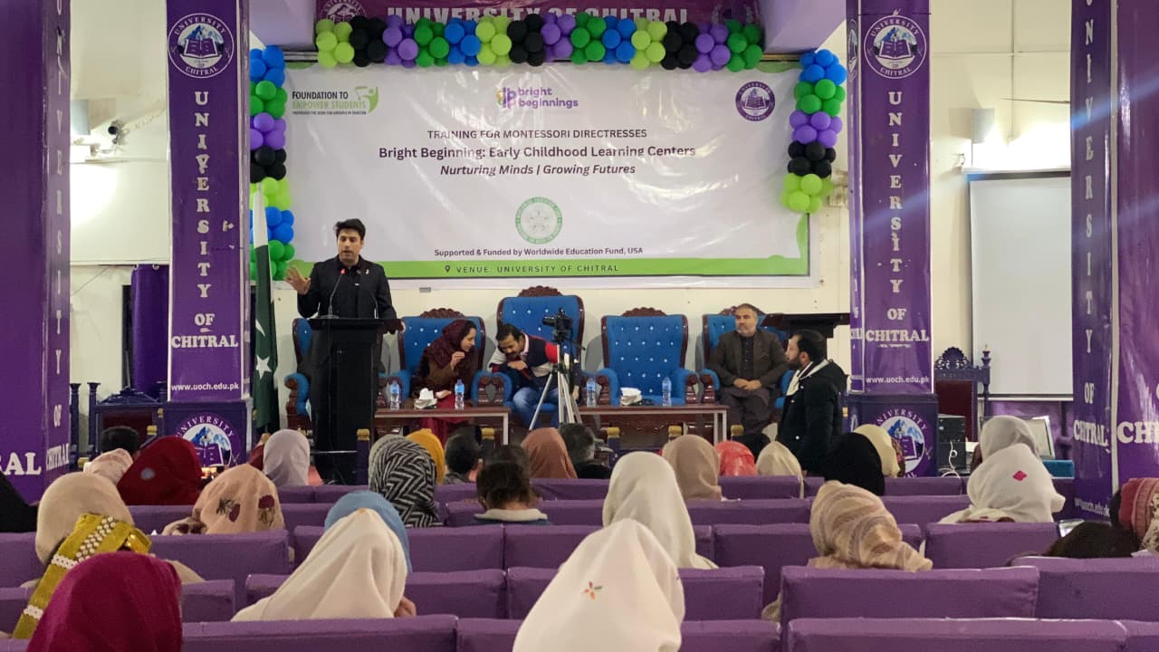 چترال (نیوز ڈیسک): فاؤنڈیشن ٹو ایمپاور اسٹوڈنٹس (FES) نے ورلڈ وائیڈ ایجوکیشن فنڈ (WEF) امریکہ کے تعاون سے جاری "ہرزنگ ٹریننگ اینڈ اسکلز ڈویلپمنٹ پروگرام” کے تحت یونیورسٹی آف چترال میں 100 ارلی چائلڈ ہڈ لرننگ سینٹر (ECLC) ڈائریکٹریسز کے لیے منعقدہ 10 روزہ جامع مونٹیسوری ٹریننگ کامیابی کے ساتھ مکمل کر لی ہے۔