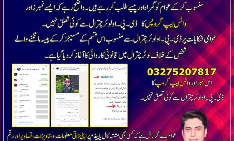 کچھہ نوسر باز عناصر واٹس ایپ گروپس پر اپنے نمبرز ڈی۔پی۔او لوئر چترال سے منسوب کرکے عوام کو گمراہ اور پیسے طلب کررہے ہیں۔واضح رہے کہ ایسے نمبرز اور واٹس ایپ گروپس کا ڈی۔پی۔او لوئر چترال سے کوئی تعلق نہیں ۔عوامی شکایات پر ڈی۔پی۔او لوئر چترال سے منسوب اس قسم کے مسیجز کرکے پیسہ مانگنے والے شخص کے خلاف لوئر چترال میں قانونی کاروائی کا آغاز کردیا گیا ہے ۔عوام سے گزارش ہے کہ کسی بھی مشتبہ کال یا پیغام پر اپنی ذاتی معلومات، دستاویزات ،تصاویر اور رقم ہرگز منتقل نہ کریں۔ کسی بھی مشکوک سرگرمی کی اطلاع قریبی پولیس اسٹیشن کو دیں۔