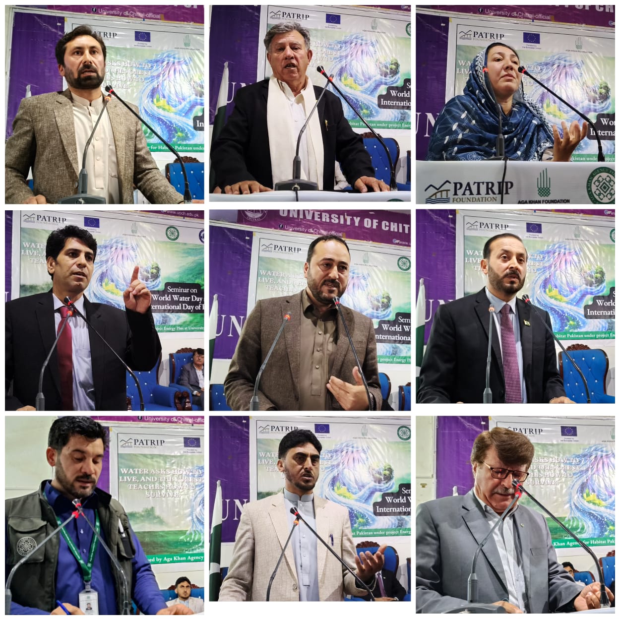 انہوں نے کہا کہ پانی بچاؤ مہم اور جنگلات کے تحفظ کے حوالے سے آگاہی ہر فرد کو اپنے گھر سے شروع کرنی چاہیے تاکہ پوری کمیونٹی اس مہم کا حصہ بن سکے۔سیمینار سے ڈیپارٹمنٹ آف سوشیالوجی کے ہیڈ آف ڈیپارٹمنٹ ڈاکٹر ثناء اللہ نے "پانی اور جنگلات کے پائیدار انتظام میں صنفی شمولیت” پر اگاہی دی، باٹنی ڈیپارٹمنٹ کے حافظ اللہ نے گرین بلڈنگز کے زریعے ماحولیتی بہتری” کے عنوان پر بات کی، زؤلوجی ڈیپارٹمنٹ کے فتح الباری نے بدلتے موسم میں پانی اور جنگلات کے تحفظ میں کمیونٹی کا کردار” پر بات کی۔ دیگر مہماناں میں انجینئر ثمینہ بلقیس، سابق ماہر تعلیم ظہران شاہ، ممبر بورڈ آف ڈائریکٹر آکاہ محمد افضل نے بھی خطاب کیا۔ آکاہ کی جانب سے یونیورسٹی میں یادگاری شجرکاری مہم بھی کی گئی۔ تقریب کے اختتام پر آغا خان ایجنسی فار ہیبیٹاٹ کی جانب سے پرنٹرز کو شیلڈز اور رضاکاروں کو اسناد سے نوازا گیا۔
