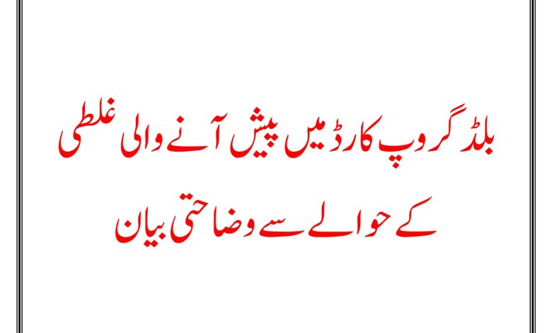 بلڈ گروپ کارڈ میں پیش آنے والی غلطی کے حوالے سے وضاحتی اعلامیہ